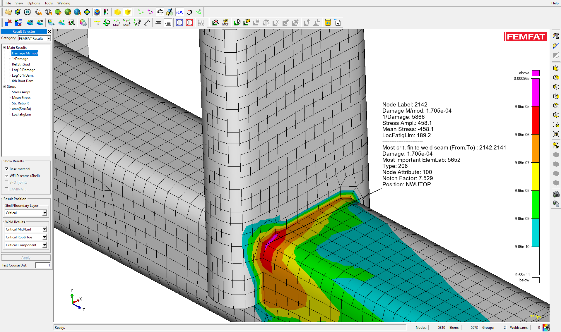 Für die Ermüdungsanalyse werden die FE-Strukturspannungen, mittels einer Datenbank entnommenen Kerbfaktoren für Wurzel und Übergang sowie für Anfang und Ende, zu Kerbspannungen hochskaliert und bewertet. Die Datenbank liegt im ASCII-Format vor. Daher können Sie für eine noch bessere Vorhersagequalität die darin enthaltenen Kerbfaktoren & Materialkennwerte an Ihre spezielle Situation anpassen bzw. überhaupt neue Stöße hinzufügen.