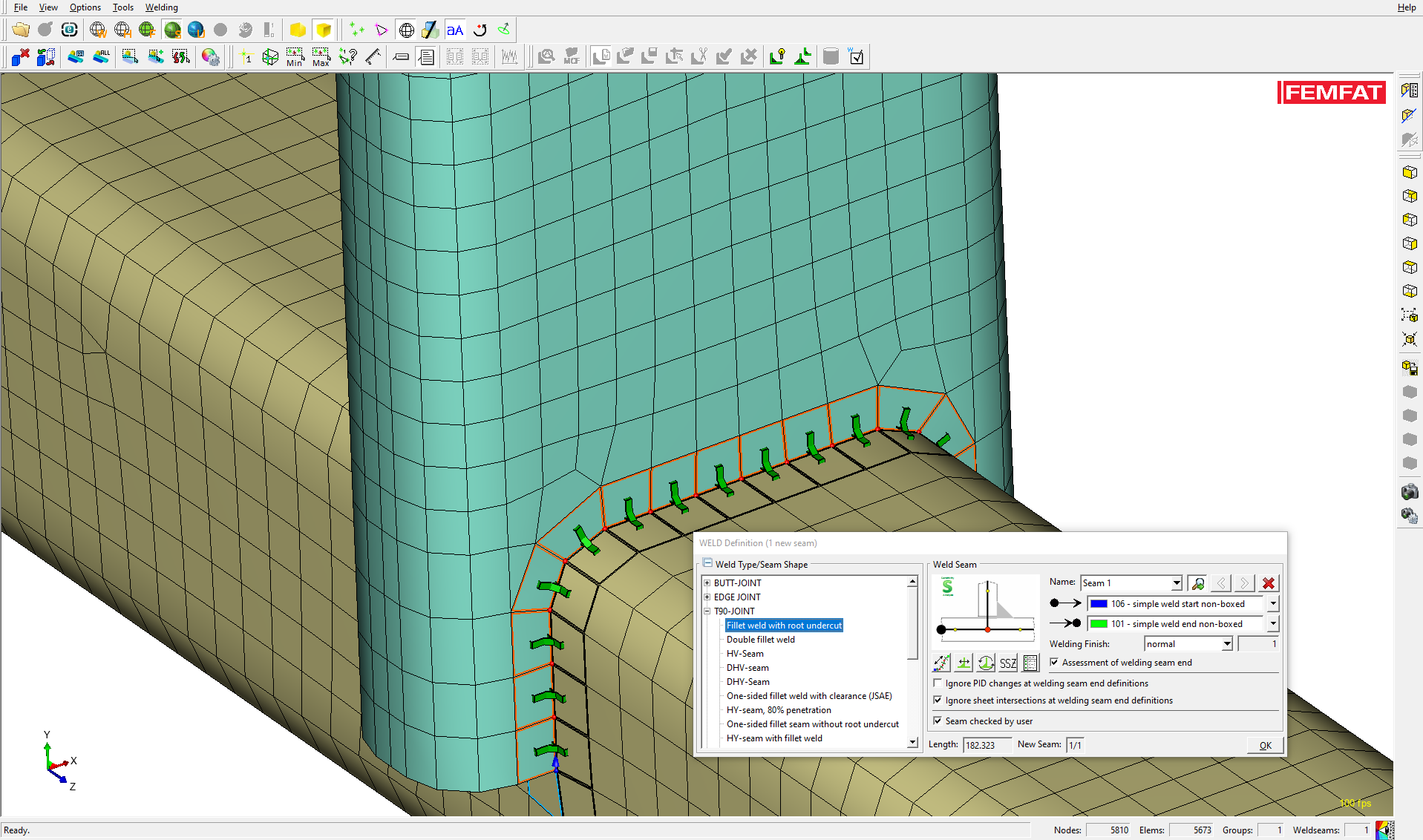 Neben den klassischen Funktionalitäten eines Postprozessors stellt FEMFAT visualizer auch hilfreiche Präprozessorfunktionen für das Programmmodul FEMFAT weld bereit. Diese ermöglichen die schnelle und einfache Schweißnaht-Definition. Dies kann vollkommen automatisch über den im VISUALIZER integrierten WELDseamScanner erfolgen. Alternativ kann der Verlauf einer Schweißnaht mit nur wenigen Mausklicks am FE-Modell definiert werden. Die Verbindungsart (T-Stoß, Überlappstoß usw.) wird automatisch erkannt. Details zur Nahtform können - mit visueller Unterstützung - definiert werden.